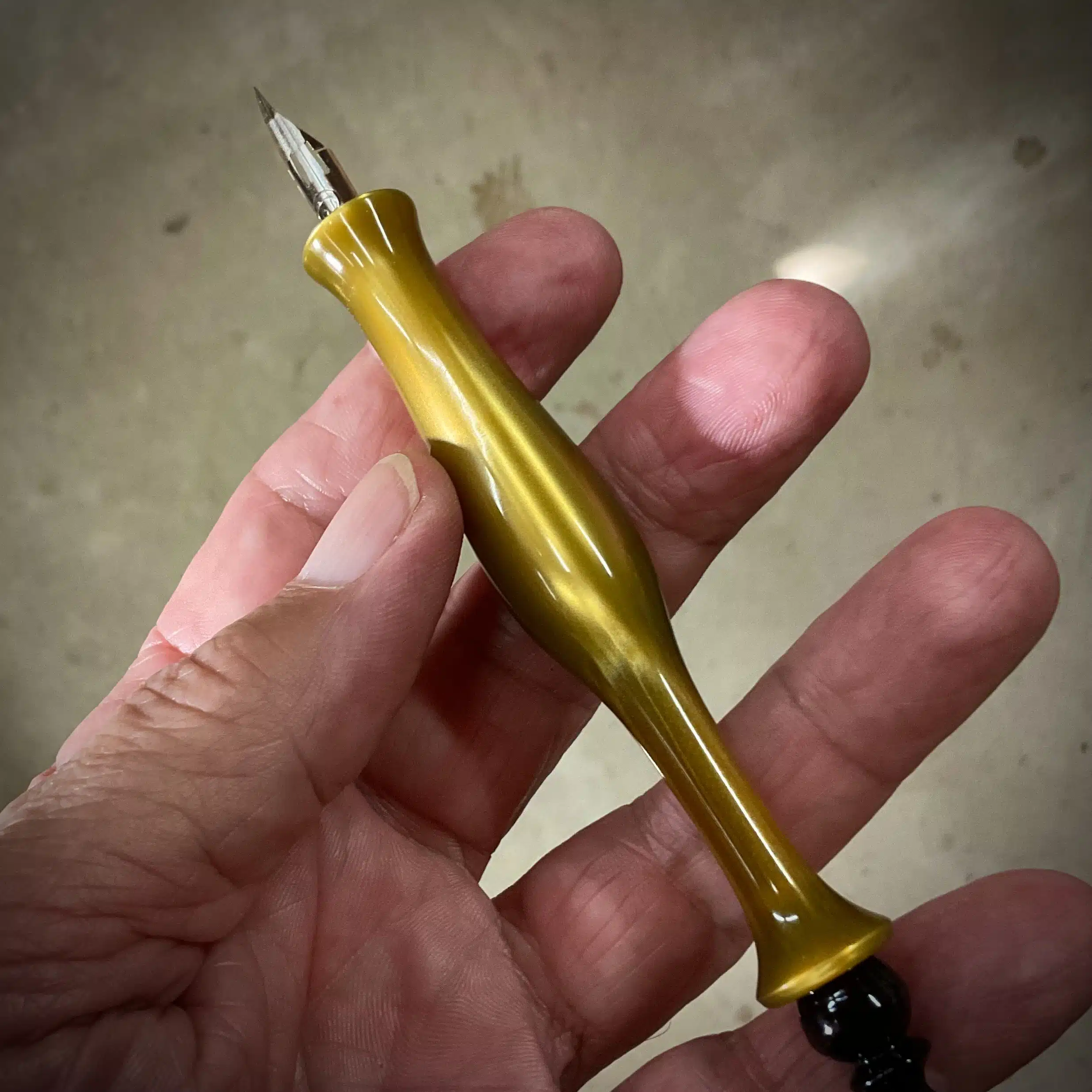 Awesome handmade straight pen holder…I used a metallic gold resin, and put a Brazilian Ebony “tail” on it. Please note that his is a straight pen holder, not an oblique.